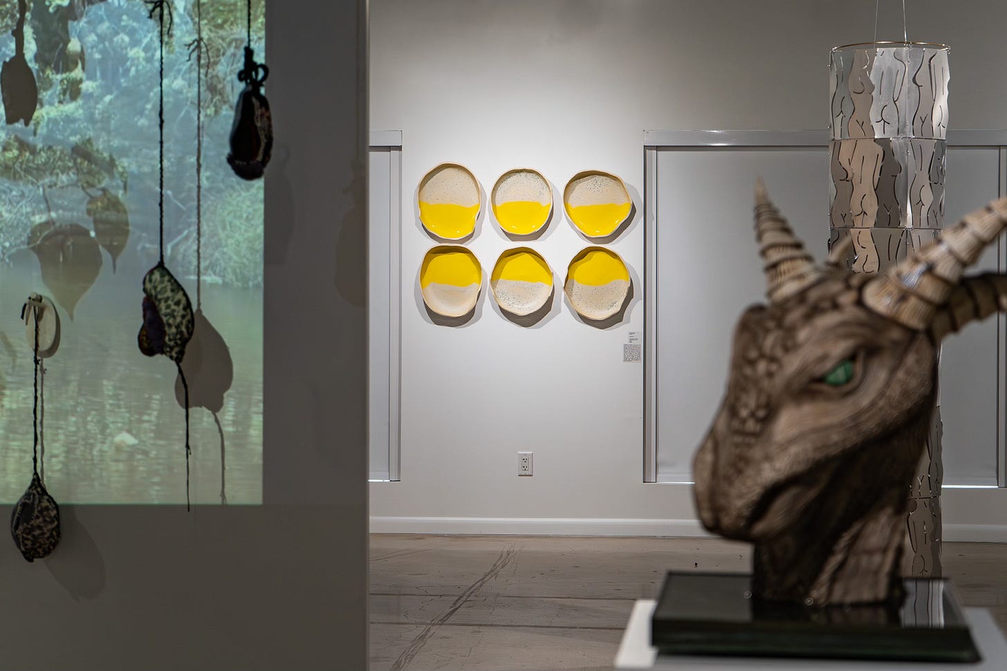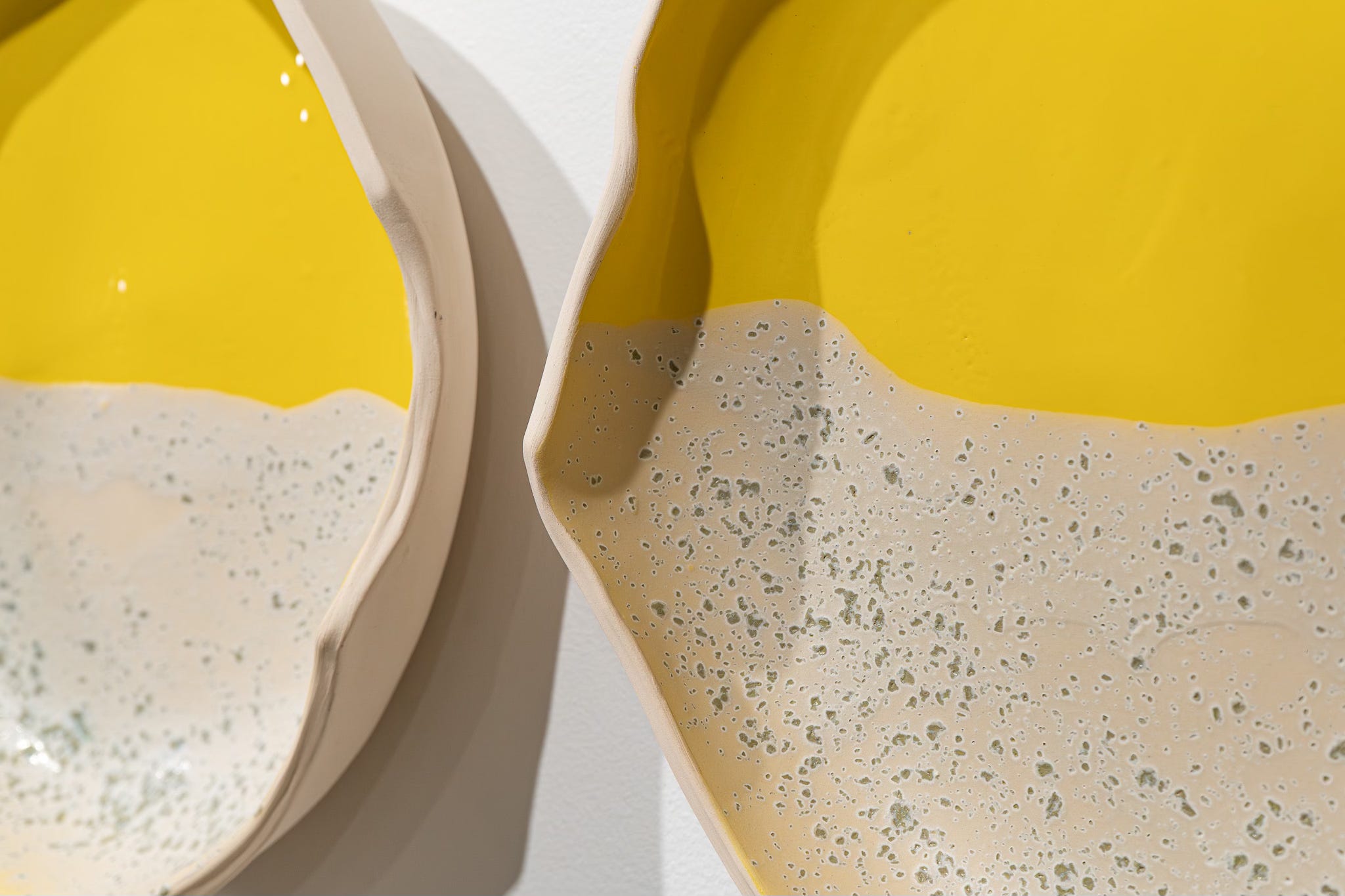 In the installation Absolute Acceptance, I explore the counterbalance of this contraction and expansion, this loss and hope. The rich, bright yellow is intended to reach out and envelop the viewer from a distance, across the gallery, with its expanding energy of hope—the hope that rises after the loss of acceptance. The work is hand-built from white stoneware and color-blocked with many layers of underglaze and glaze, creating the density of color that allows it to move forward with the expansion of hope.
