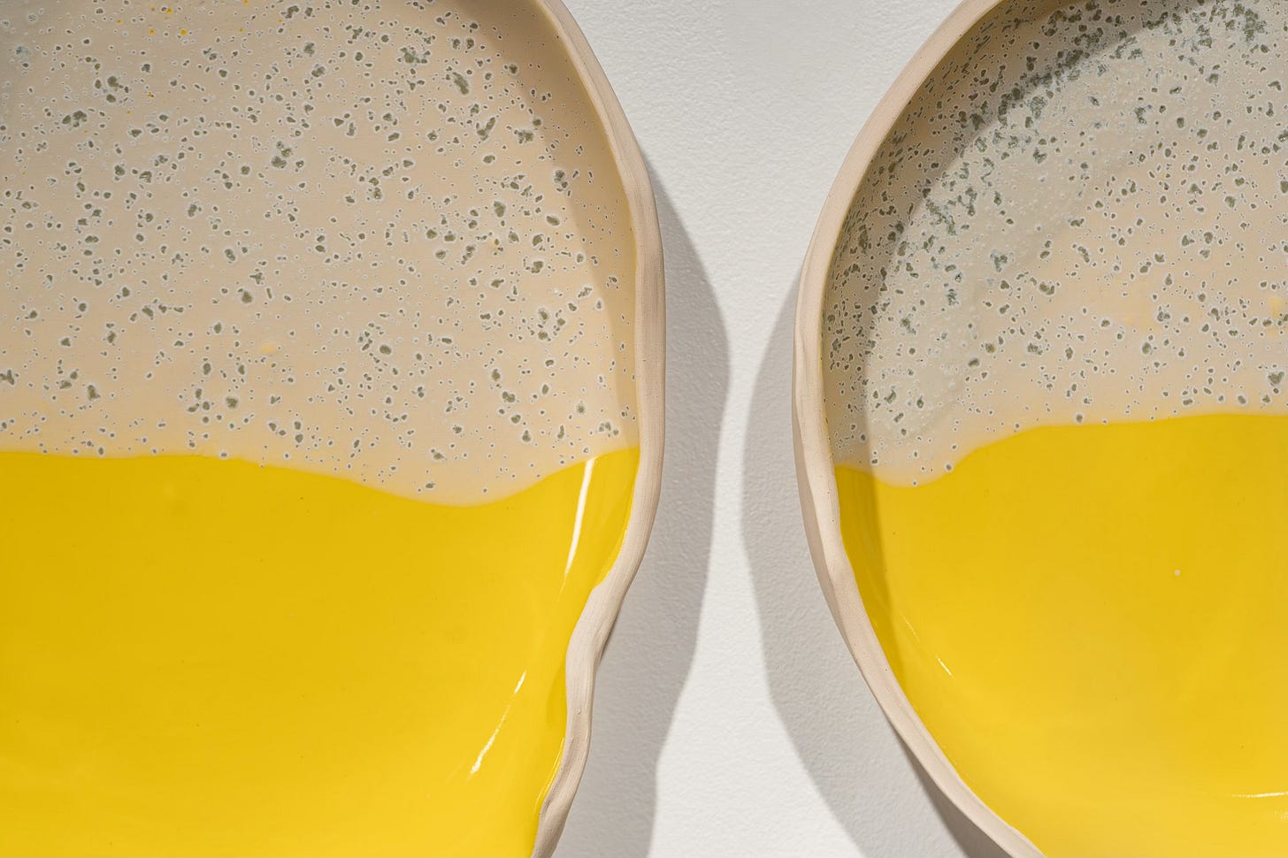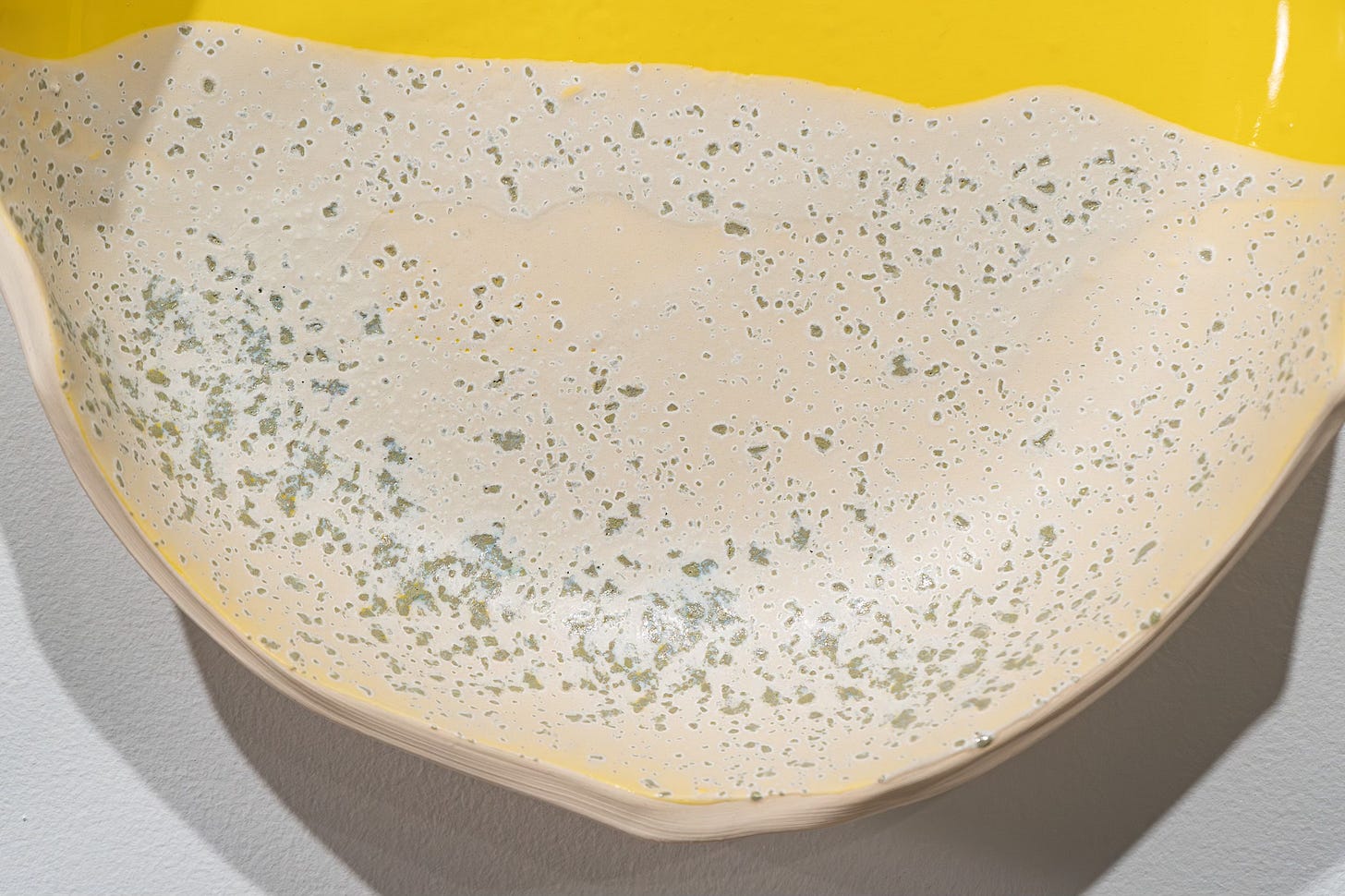 Absolute Acceptance, photographed above, explores a color vision that ceramic artist Landis Carey experienced in the summer of 2023, in which yellows gently fluctuated from deep ochre to sunshine to straw as pure white light pierced the color veils. The color experience brought the message of absolute acceptance and remains a place of meditation that the artist often taps into. Hand-built from white stoneware clay, ceramic artist Landis Carey glazed Absolute Acceptance to draw upon the densest yellow of her color vision, which holds the strongest feelings of absolute acceptance. The artist presents this message while juxtaposing it with the most earthy, grounding yellow she experienced during that meditation. The rich, deep yellows of Absolute Acceptance are intended to reach out and envelop the viewer from a distance, drawing them into the simultaneous feelings of momentary contraction and enduring expansion that mark the point of acceptance. For more of Landis’s art, follow her on Instagram.